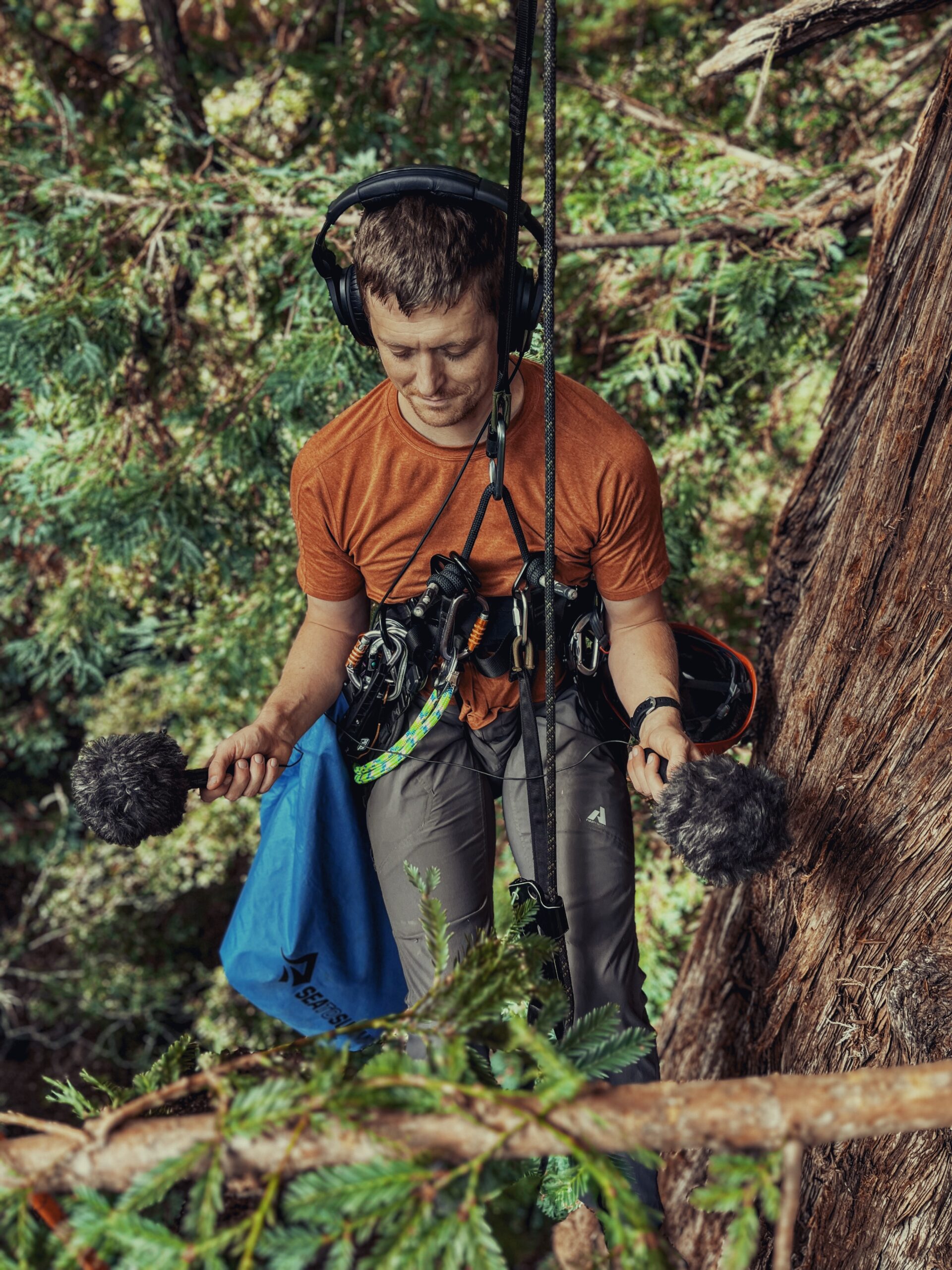 “Being in a harness for hours, dealing with batteries and SD cards, while trying to attach everything to the branches—it was tricky,” he adds. “But the reward of being able to capture sounds from the tree’s canopy and juxtapose that with the sounds from the forest floor made it all worth it.”