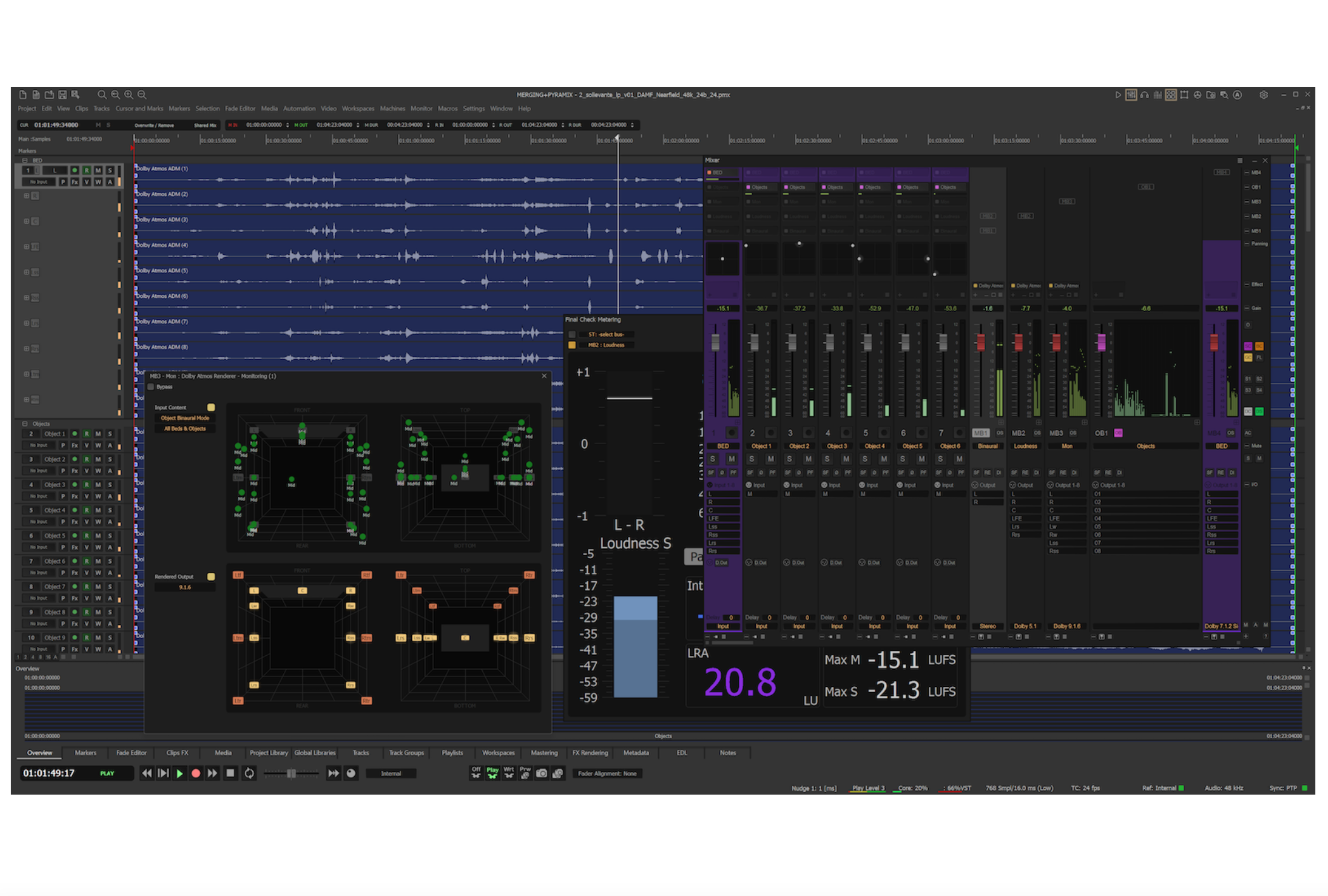 Beyond PanNoir, Pyramix Premium now includes a built-in Dolby Atmos Renderer supporting speaker configurations up to 9.1.6 as well as binaural for headphones. Live Re-Renders and loudness measurement via the Pyramix Final Check meter are also included, significantly reducing setup complexity for immersive music production.